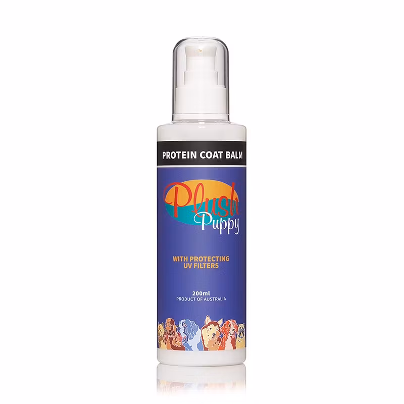 Plush Puppy Protein Coat Balm är ej fet, ger en lätt finish för att minska statisk elektricitet och fladdrande uppträdanden vid visningar.